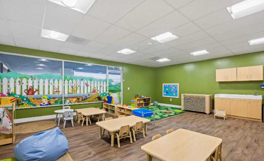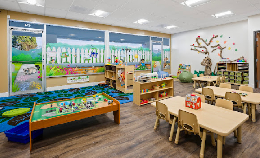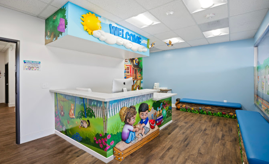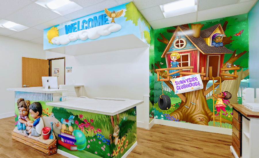Welcome to a cozy backyard themed early learning center, where landscape murals bring a park atmosphere inside. As families enter, they are greeted by a 3D sculpture of children laughing and playing in a sandbox on the front desk. Cozy benches, a welcome sign, and friendly mural of a treehouse make everyone comfortable in this front reception area.