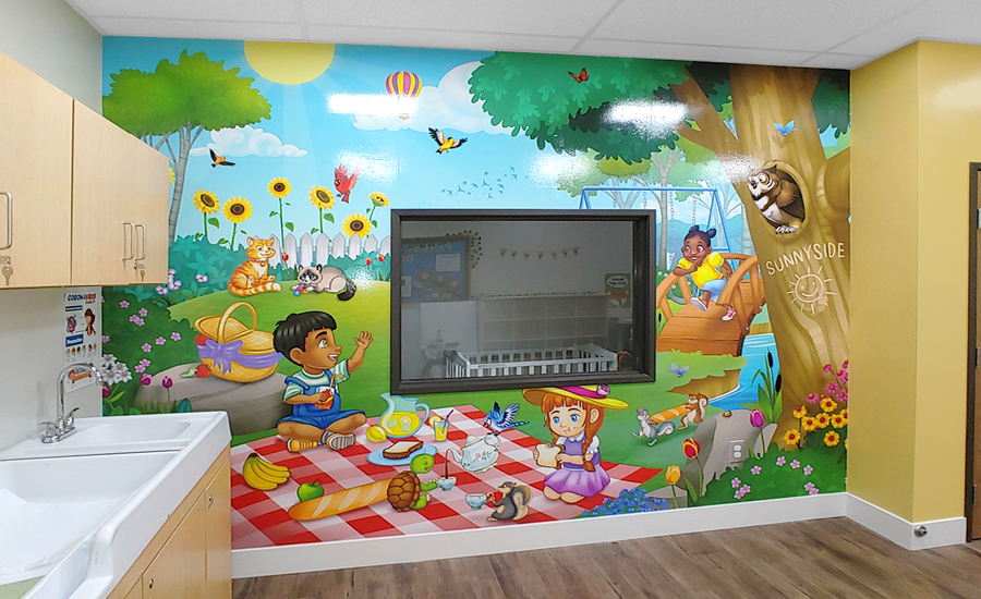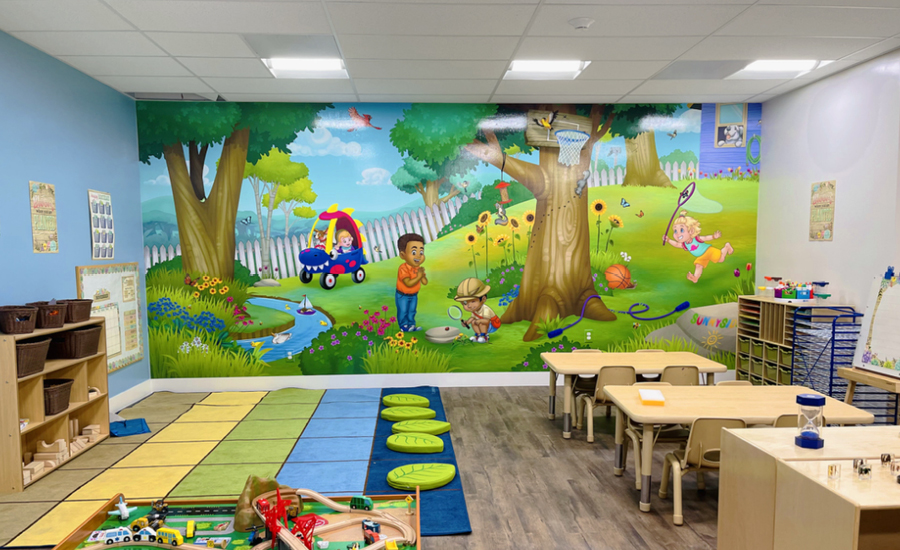 The walls of the daycare are adorned with beautiful, illustrated murals that depict a variety of backyard scenes. There are tall trees with leaves rustling in the breeze, a babbling brook that flows through the grass, and a garden filled with colorful flowers. Illustrated children explore these fanciful scenes.