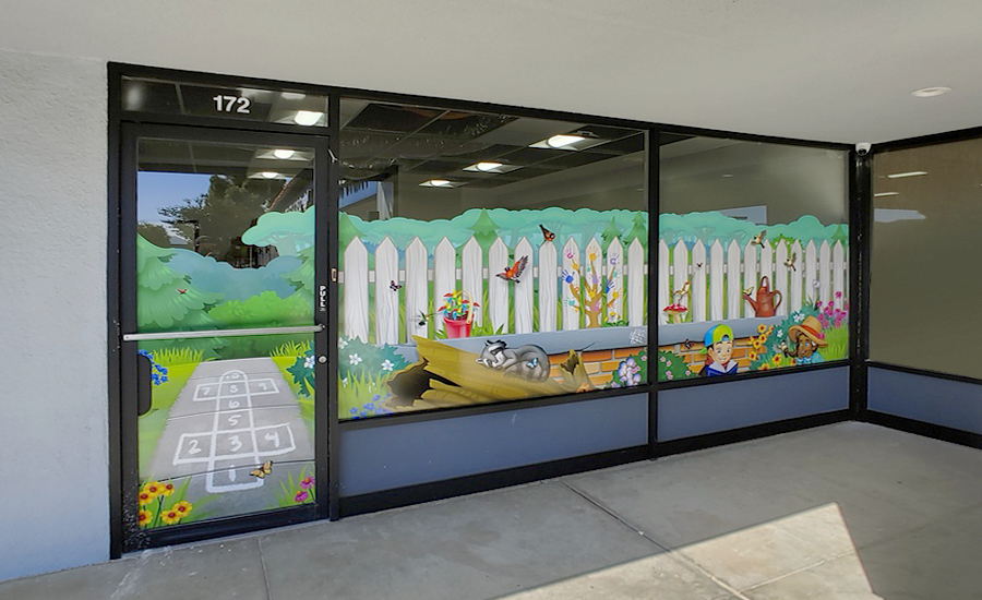The murals continue on the windows, providing privacy from people on the sidewalk outside, all while creating a bright and cheerful atmosphere inside. The exterior murals do a great job of advertising the business as a kid-friendly place as well.
