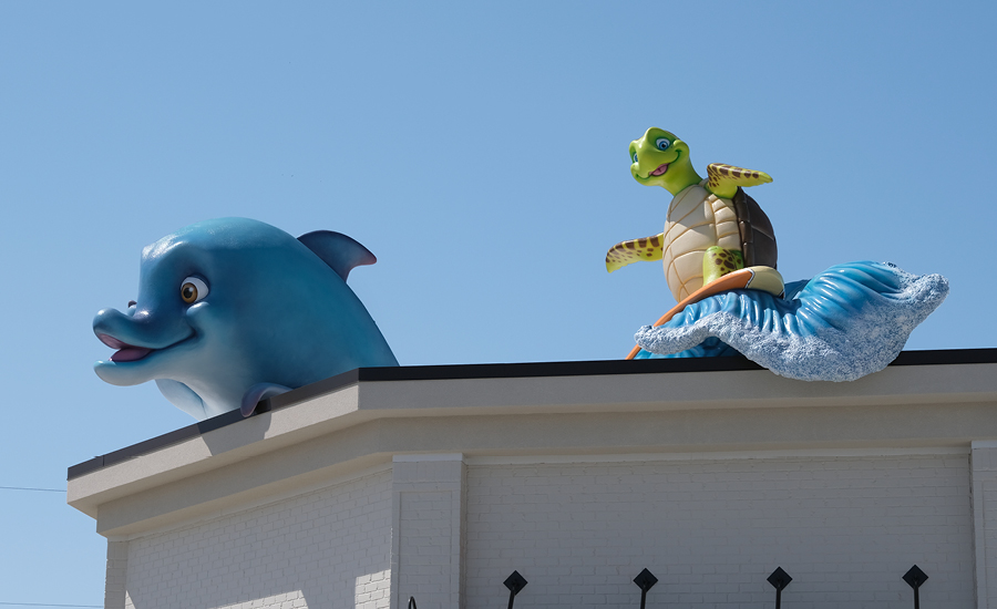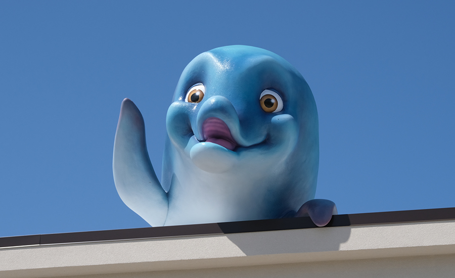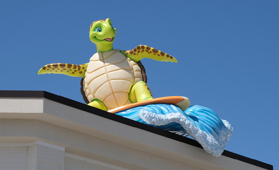 Surf’s up when patients pull up to the pediatric entrance of this underwater themed medical clinic. On the roof, you’ll see not one, but two landmark characters. A turtle catches some waves, while a dolphin greets patients with a wave.