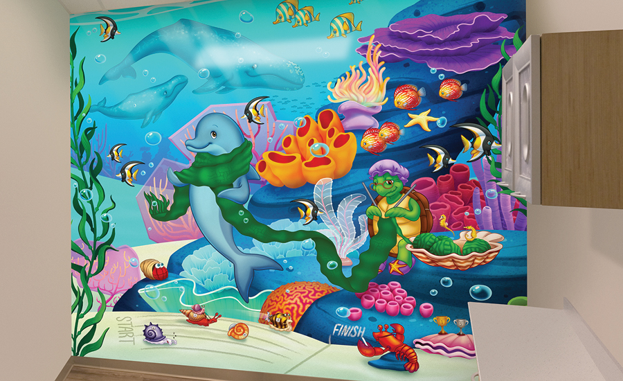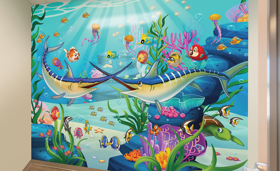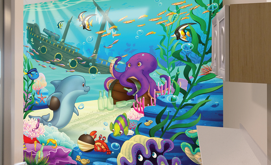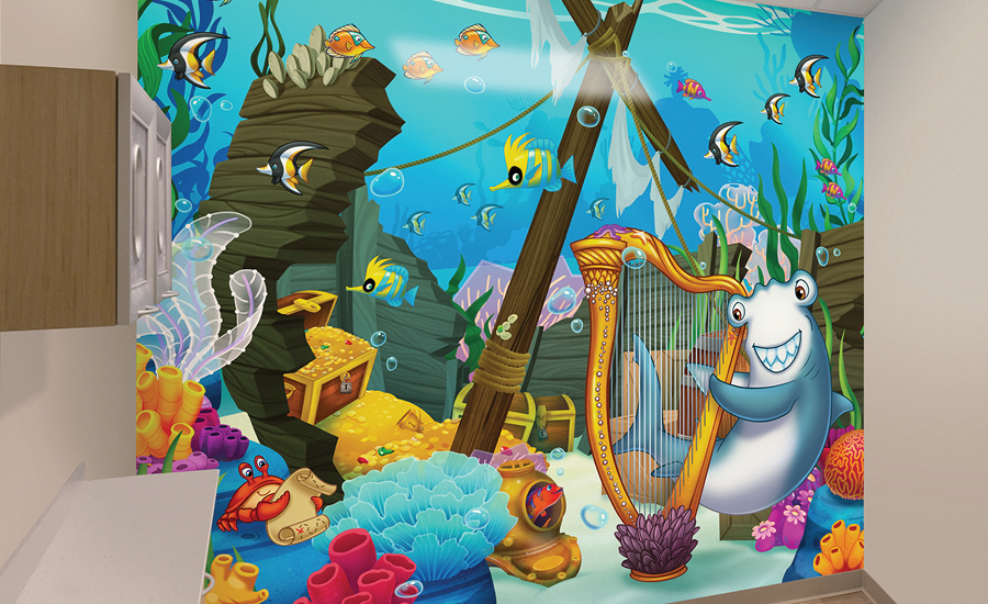 The office halls feature beautiful silhouette wall murals, adding some stylish theming to the common areas. In the medical exam rooms, animated underwater scenes are sure to delight patients. Check out the clever visuals – such as the granny turtle knitting a kelp scarf, or the parrot fish… that looks like a parrot. There is so much to discover with every visit.