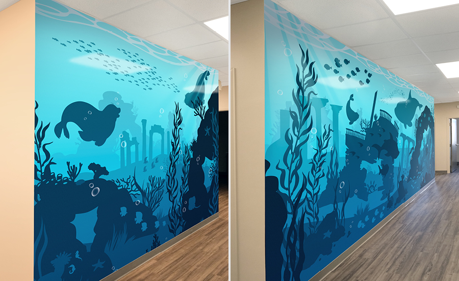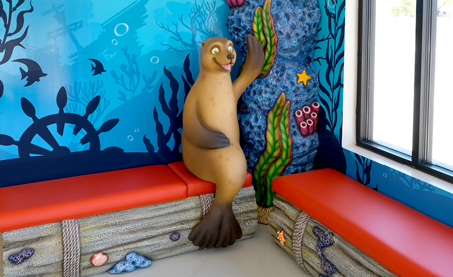 Inside the clinic, blue murals and 3D coral create a cool and calm waiting area. A friendly seal sits on top of a custom sunken wood bench. The comfy seating area is a perfect place to relax, or grab a quick photo opportunity to share on social media.
