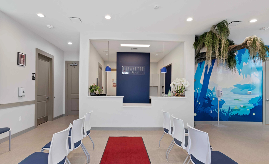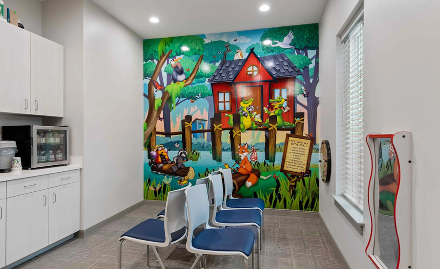 Welcome to our latest featured project: a beautifully designed dental office that takes you down the bayou. From the moment they enter, young patients are greeted by a welcoming environment with a striking dark blue accent wall filled with vibrant silhouette murals. The modern seating area combined with whimsical touches like the mossy tree branches, sets a playful and comfortable tone for both adults and children.