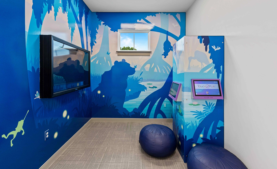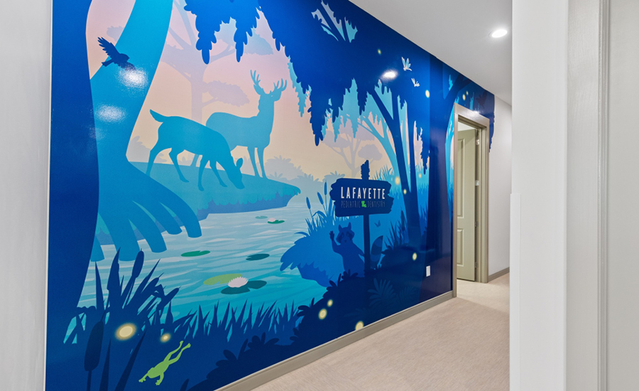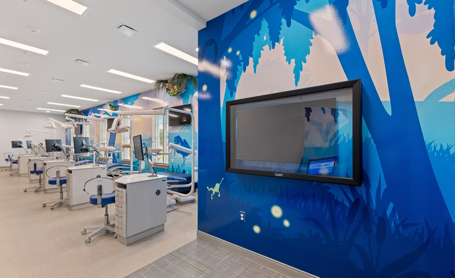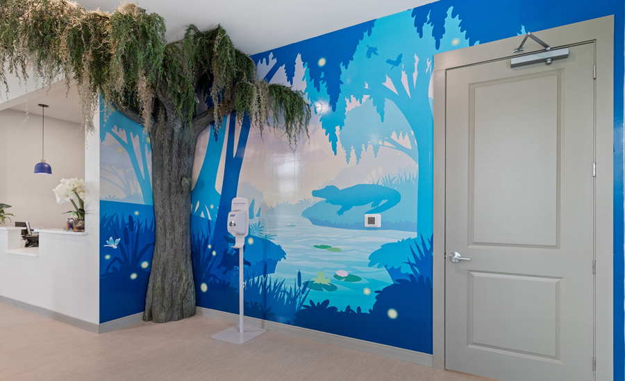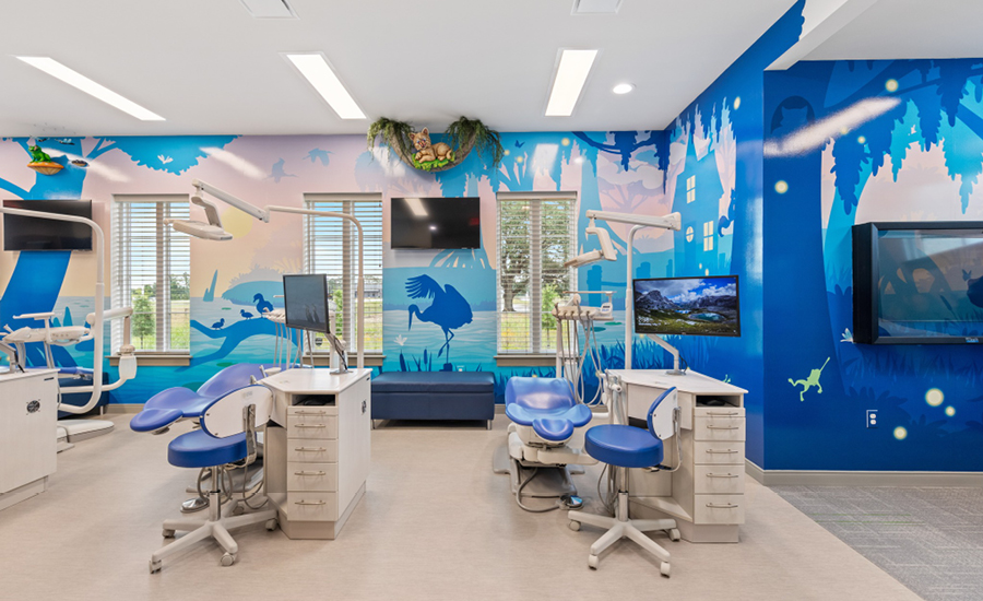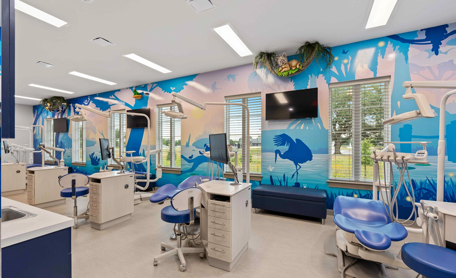 Throughout the office, bayou-themed murals provide a calming atmosphere. These serene scenes of wildlife and lush vegetation guide patients through the space, enhancing their comfort and reducing stress. The treatment areas are equally inviting, with each dental workstation set against the tranquil backdrop of the bayou. 3D sculpted bayou critters hang from the ceiling in front of each station.