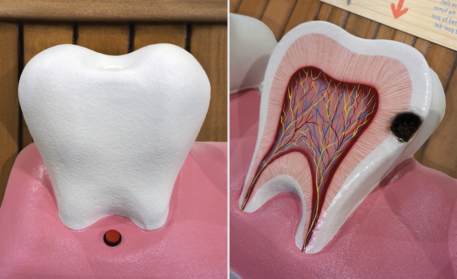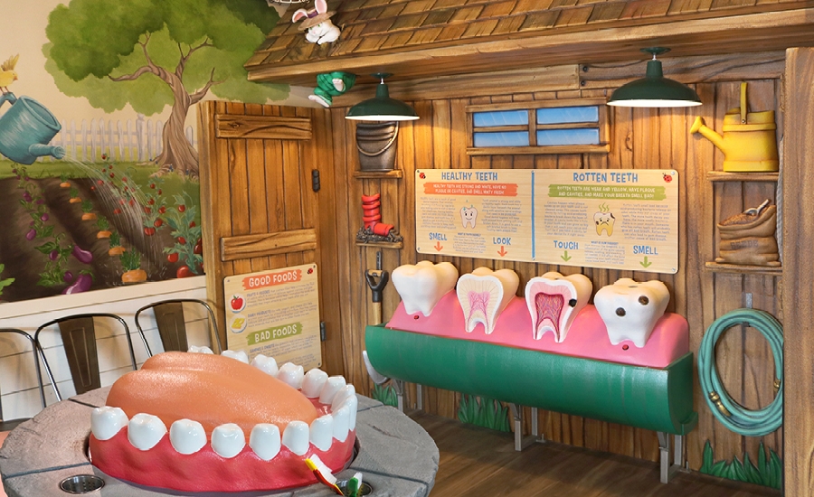 Giant tooth sculptures with cut-away graphics and fake cavities sit in the shed area and have illustrated signs above explaining the difference between healthy and unhealthy teeth. The sculpted bunny falling through the roof shows there is still fun to be had even while learning.