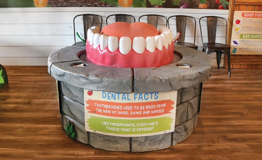 This office is bursting with activities for young patients to enjoy! Educational elements were a big part of this office design. A large sculpture of interactive teeth sits on top of a garden fire pit and kids can practice with the oversize toothbrushes and floss.