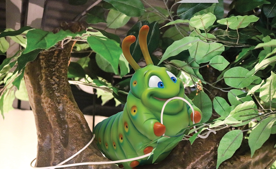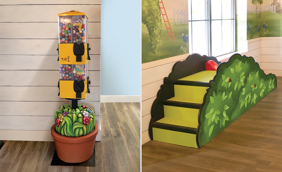 Further down the hallway, above the brushing station are two sculpted branches with 3D butterflies and a chubby caterpillar learning to floss. Visitors of all ages will enjoy this welcoming and interactive environment!