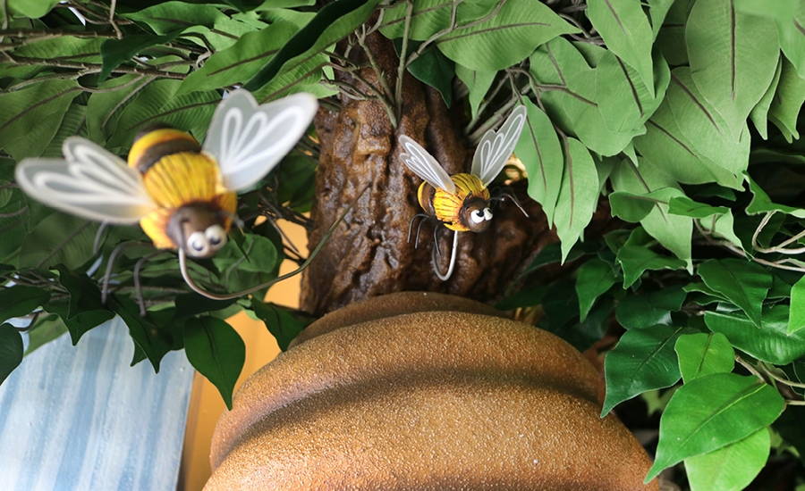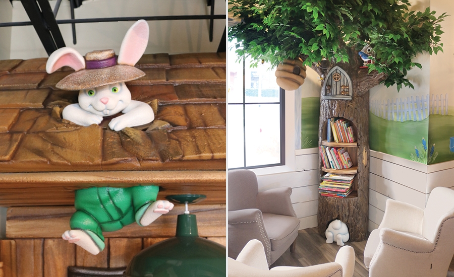 The peaceful waiting area features a sculpted tree with a built-in bookshelf, a birdhouse, a beehive sculpture, and a cheeky little bunny disappearing into his den at the base of the tree.