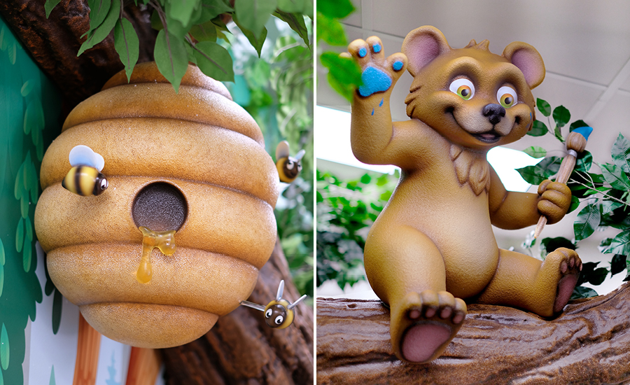 The centerpiece of the space is a custom-designed sculpted tree that extends into the room, complete with a playful bear cub perched in its branches, wielding a paintbrush and adding its own artistic touch. Beneath the tree, a cozy area invites children to engage in creative play. The 3D honeycomb with buzzing bees adds another layer of whimsy.