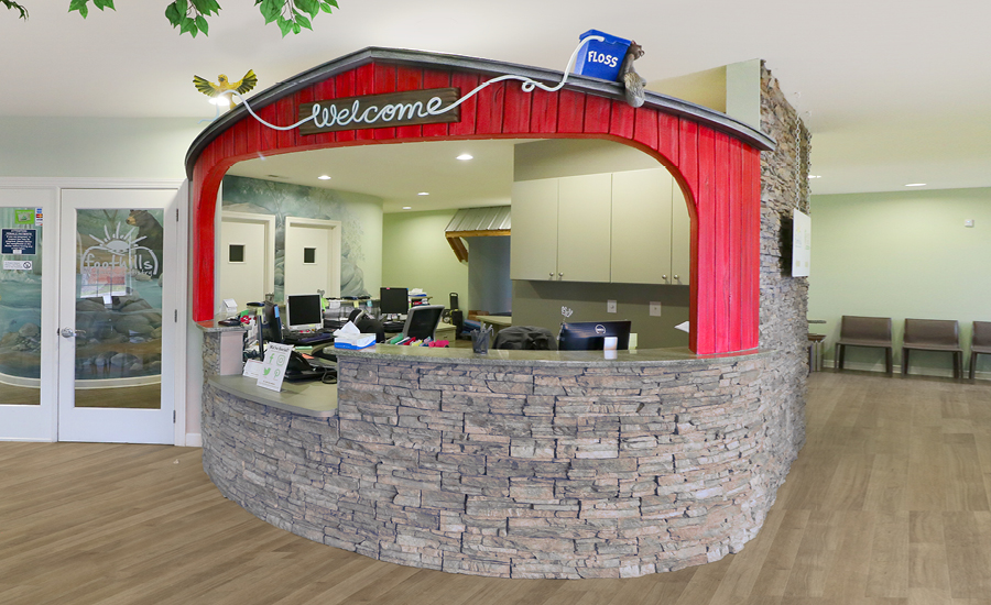 The reception area is made to look like a covered bridge, acting as the “entrance way” into the rest of the theming. A cute squirrel and bird hold up a custom dental floss welcome sign.