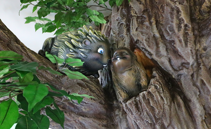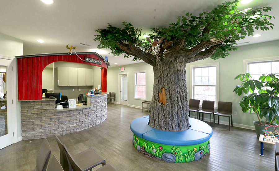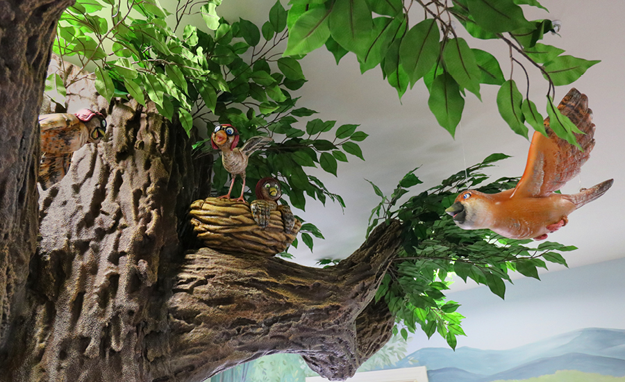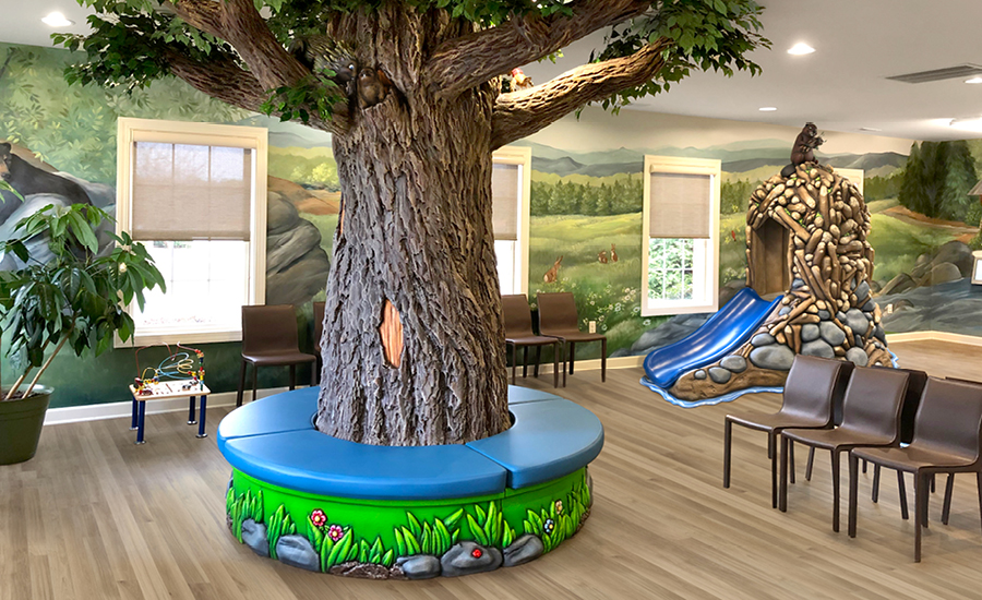 In the waiting area you’ll find an impressive floor-to-ceiling tree trunk circular bench. Carved with realistic bark details and complete with foliage, the trunk features a group of cute animals within its branches. A nest of baby Carolina wrens and adopted turkey chick prep for their first flights, while their mother flies by in encouragement. Beside them is a mother porcupine nuzzling her own adorable baby! Seating like this is an excellent way to create a dazzling themed centerpiece for your office without taking up extra floor space. It also makes for a great way to pass the time while patients take pictures as they wait for treatment.