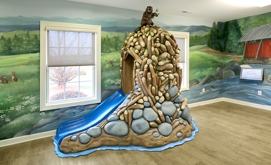 In the play area, kids will love the beaver dam slide. On top is a beaver ‘constructing’ their home, while the muddy river base intersects with a narrow rim of sculpted water for an eye-catching pop of color.