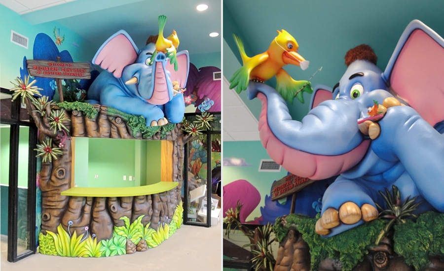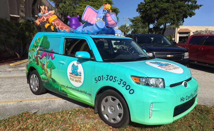 Some giant and friendly exterior characters attract new patients with a flossing elephant and his monkey friend. A fully themed “traveling billboard” complements their marketing efforts by continually generating word of mouth, whether it is parked or driving around town!