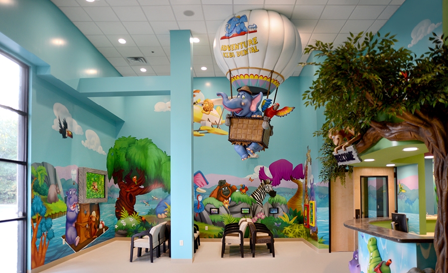Children enjoy the built-in video games and hands-on play found in the waiting room and there is also a unique photo-op in the treatment area to keep them entertained. Here they can pose with a giraffe and a monkey that holds up a sign with the office logo.