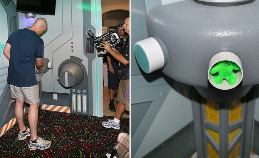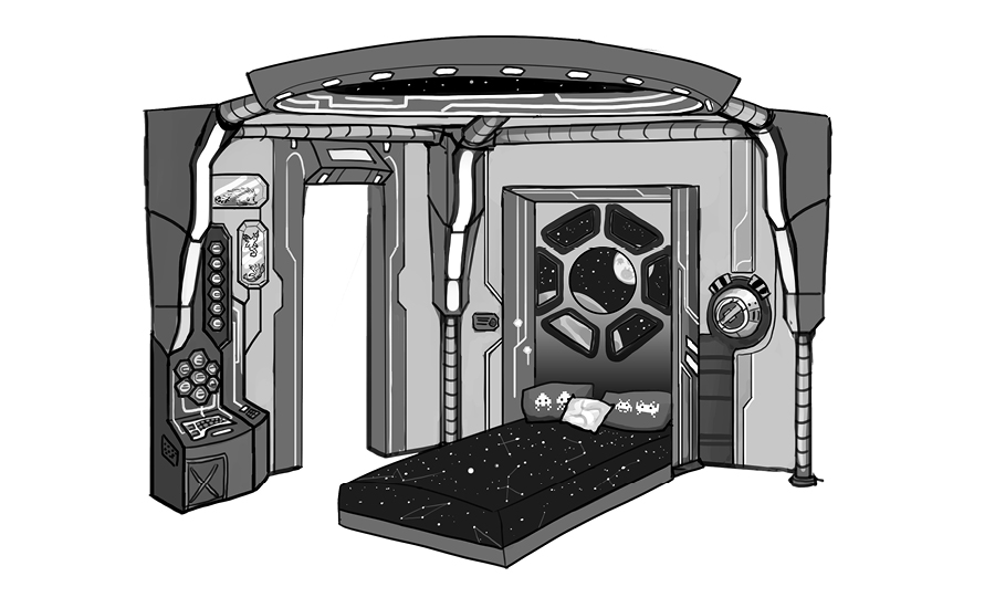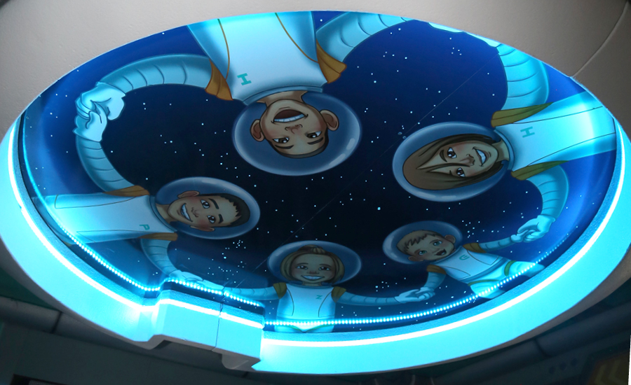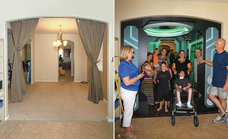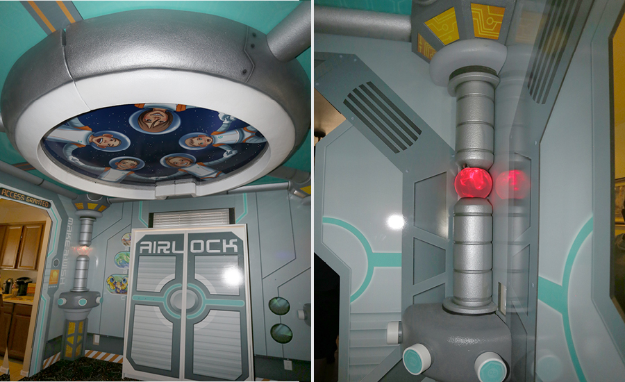 Isaac has cerebral palsy and sits at a slant in his wheelchair to keep his airway open for breathing. Because of this, he only looks at the upper portion of room, making his bedroom design unique. While the whole room is covered in murals, lights and toys, the IDS designers focused on the ceiling to create a special mural depicting Isaac and his siblings. Color-changing LED lights and glow in the dark stars add a whole new dimension. Toys hidden in special chambers and a custom-made alien in a cryotube add hidden surprises to the new decor.