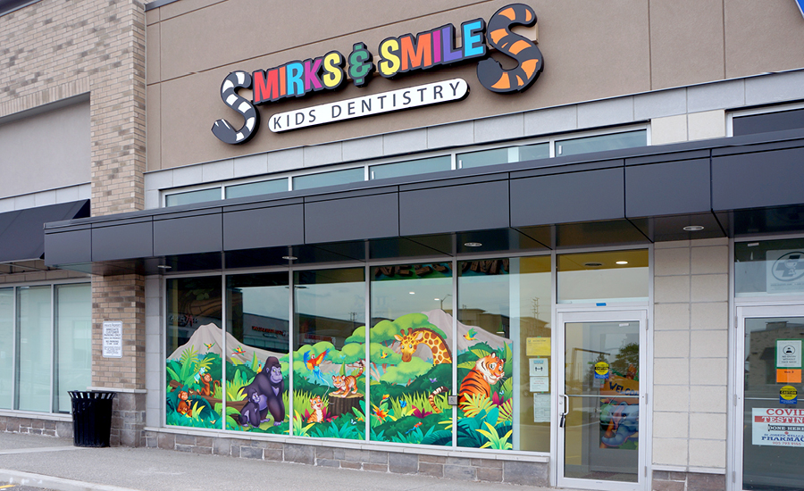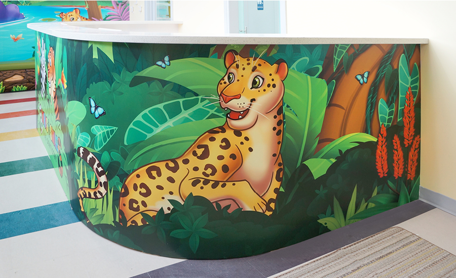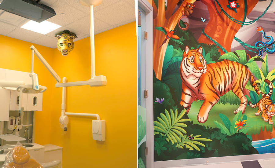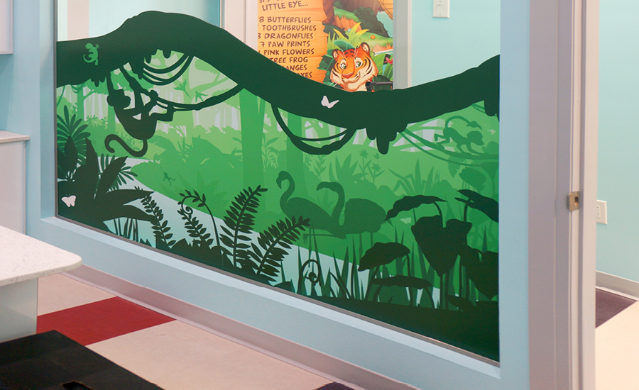 Smirks & Smiles Kids Dentistry has been outfitted with the perfect selection of silhouette murals and friendly characters to create a jungle atmosphere.