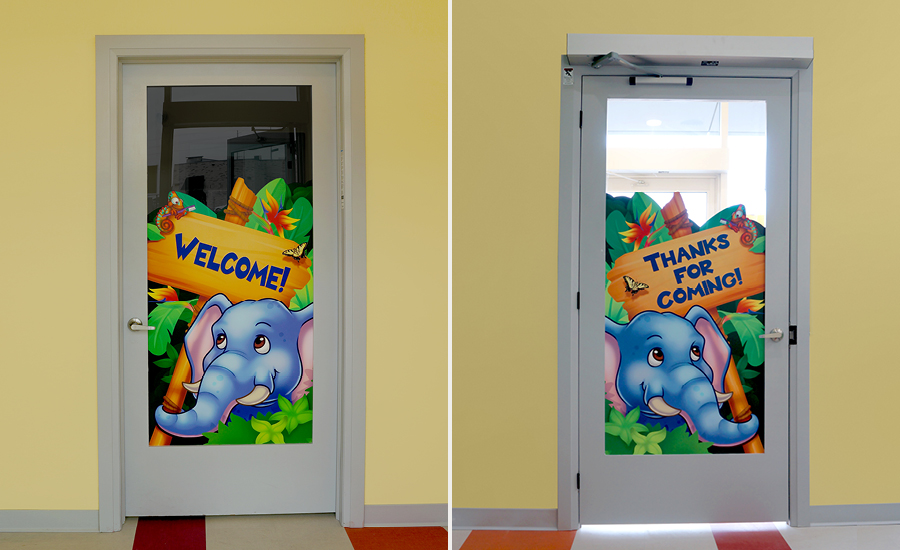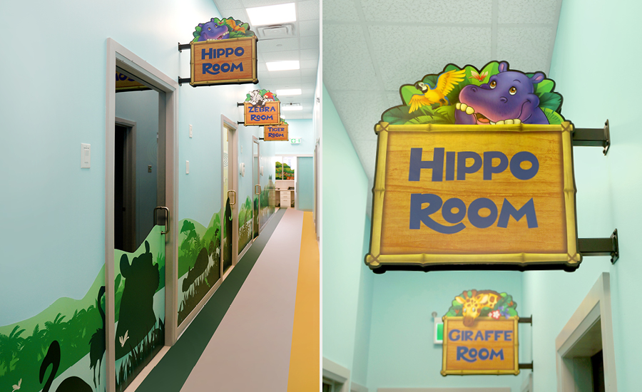 Come time for the appointment, patients will be ushered down a vibrant hallway lined with silhouette murals and creative wayfinding signage. Which room will be their favorite – the Hippo Room or the Zebra Room? And once they are settled in the treatment chair in the hygiene room they will be kept company their entire appointment by the Smile Tile friends smiling down from the ceiling.