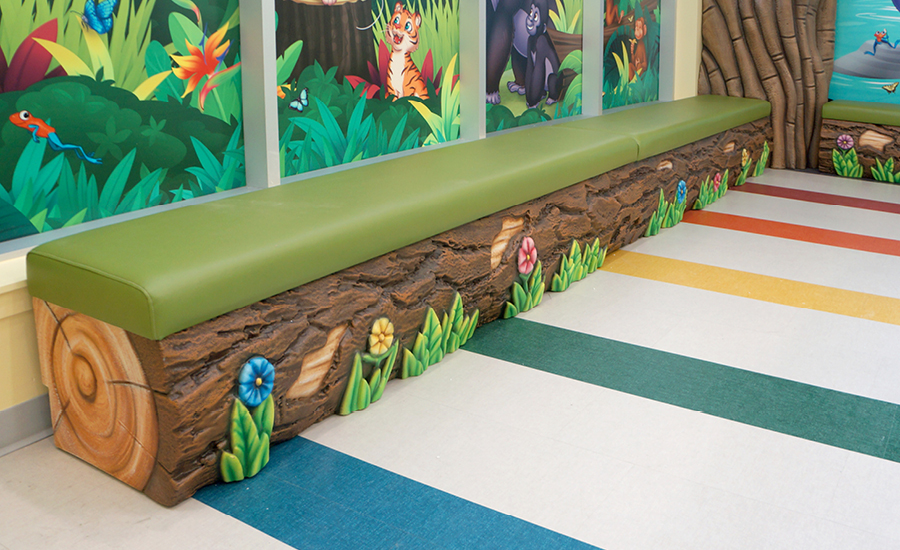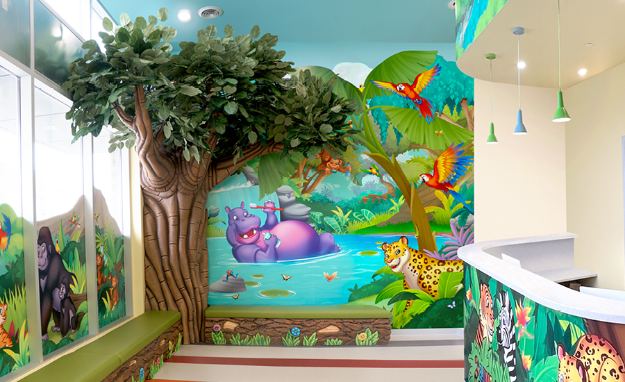 While waiting for their appointment, guests can can hang out on the log benches under the shade of the whimsical jungle tree. How many animals can you name on the striking murals all around?