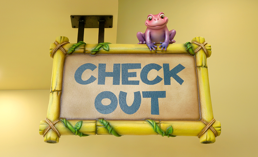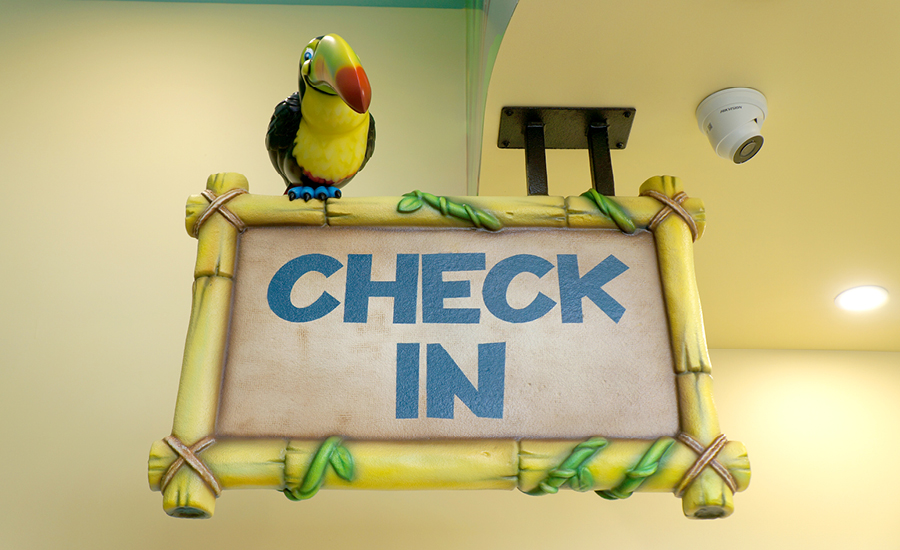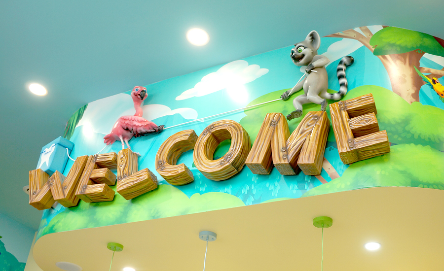 Once inside, they will be welcomed into the space with thrilling elements in the reception and waiting room area. As they approach the check-in desk they can look up to see the welcome signage with the cute animals playing tug of war over the hand crafted “WELCOME” letters.