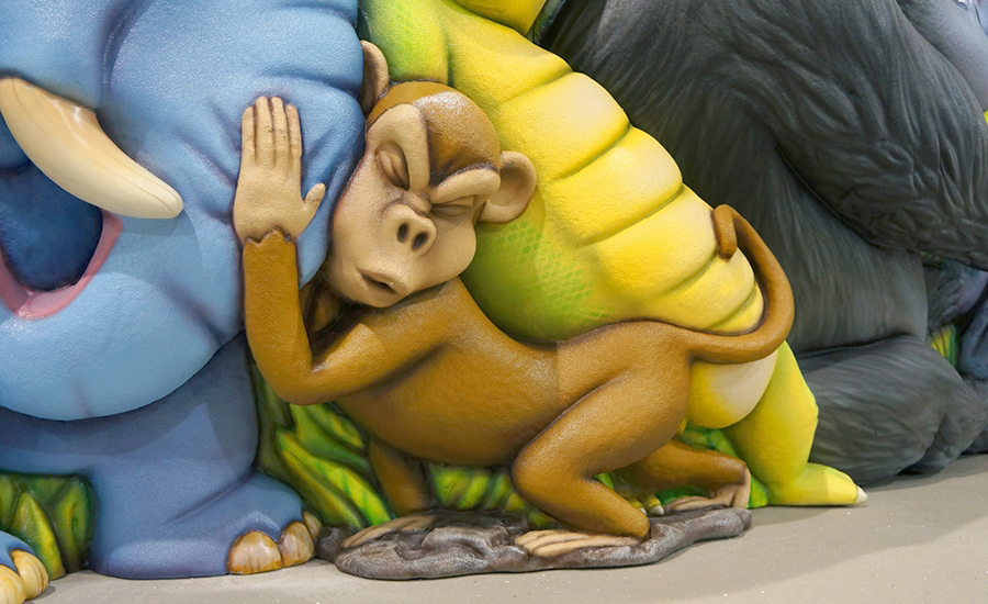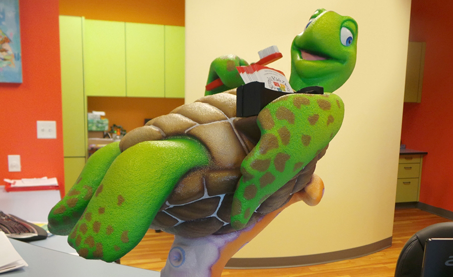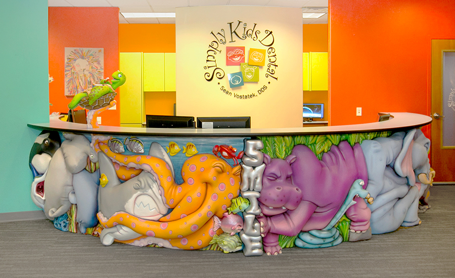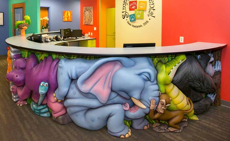 Marine life and land animals alike use teamwork to push for healthy smiles in an intense competition that will amuse visitors of any age. Sculpted to the finest detail, muscles are tense and lips are pursed on these fantastic characters. The colorful animals match the vibe of the bright colors in the office. With so many animals, there will always be something new to notice in this fun packed reception desk!