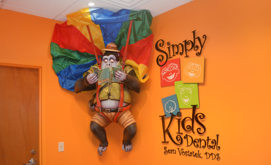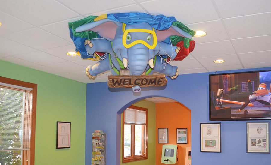 The fun doesn’t stop in the waiting area. An elephant parachutes down from the ceiling with a welcome sign, and a lost gorilla hangs from another parachute. Children will find a group of helmet-wearing, zip lining animals guiding them into the treatment rooms. Children will be looking for the next animal around every corner!
