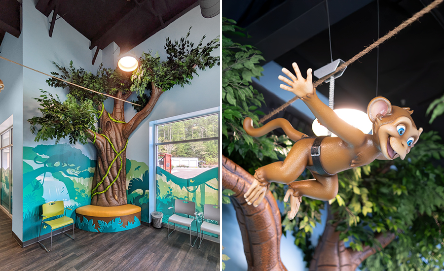 The adventure continues in “The Jungle Room”, where a custom archway invites kids to step into a rainforest wonderland filled with animated parrots and monkeys. The waiting areas feature colorful seating that pops against the lush greens and blues of the murals, making every space feel alive and inviting.
