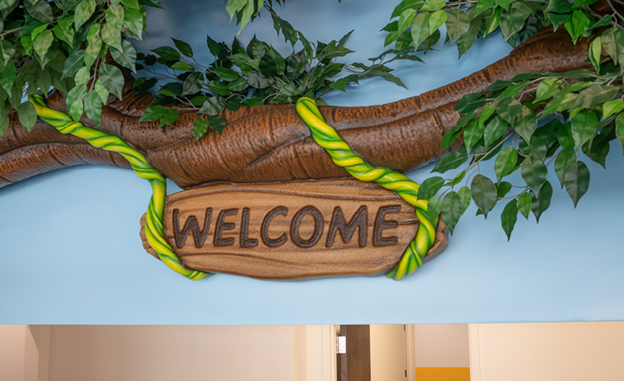 Inside, a towering 3D sculpted tree stretches over the reception desk, complete with swinging vines and a mischievous monkey ziplining through the branches. The vibrant silhouette wall murals wrap around the space, where silhouettes of animals, trees, and adventurers create a whimsical yet calming atmosphere.