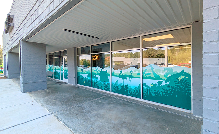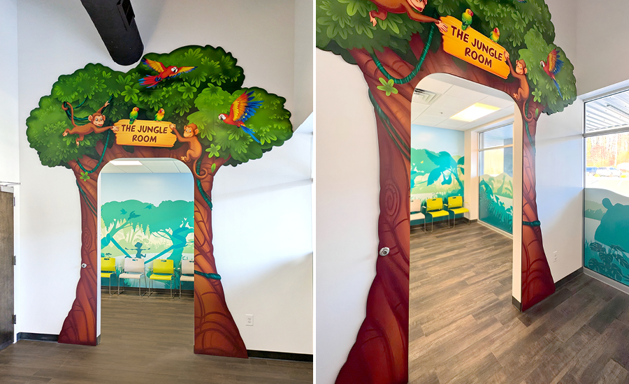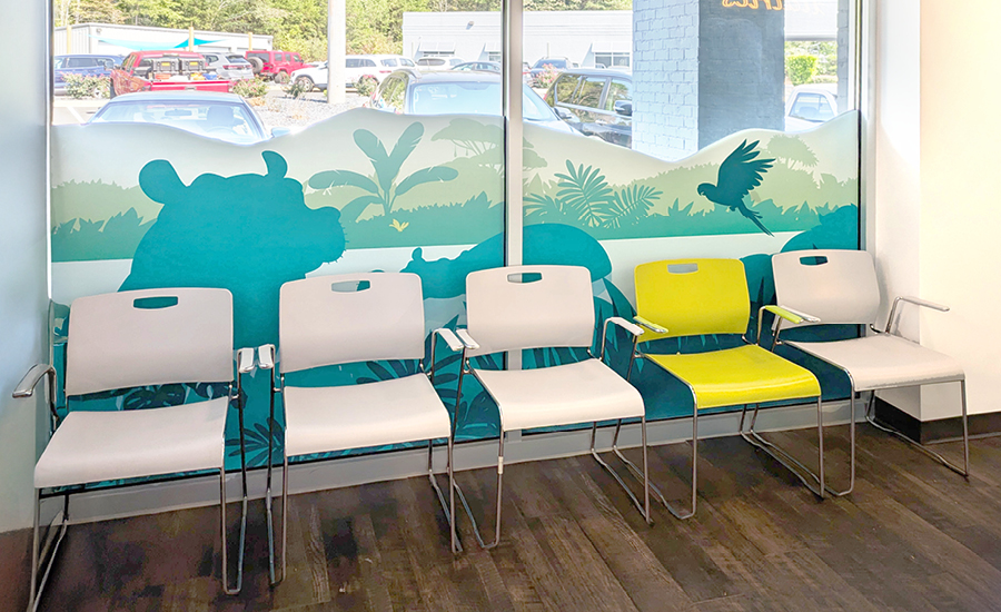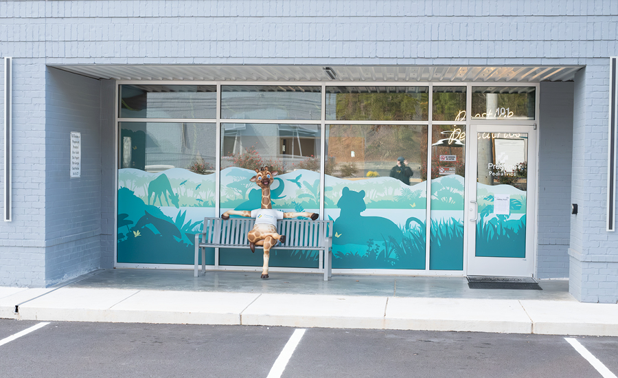 Step into this pediatric office, and you’re instantly transported into a wild jungle adventure! From the moment families arrive, they’re greeted by playful jungle animals peeking through the custom window murals that transform the exterior into a lush, tropical escape.
