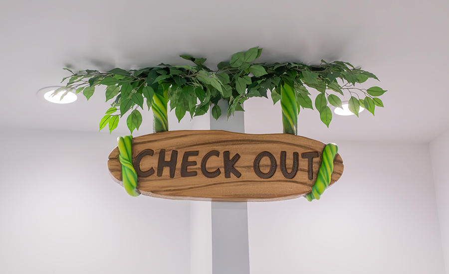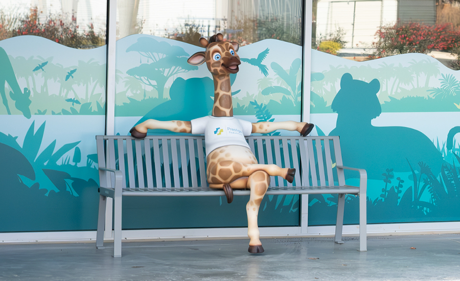 A friendly giraffe says farewell to little explorers as they take a seat on the exterior photo op jungle bench. From check-in to check-out, this immersive jungle design turns a routine doctor’s visit into a delightful expedition!