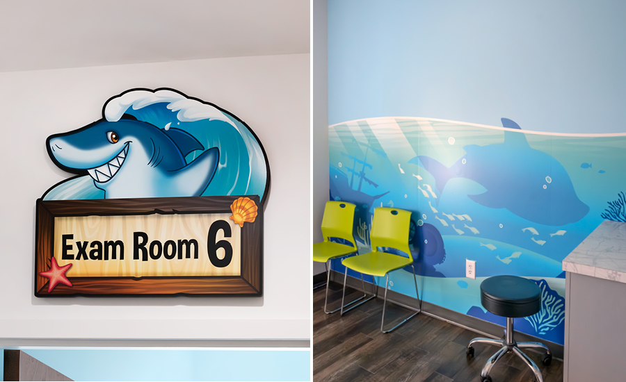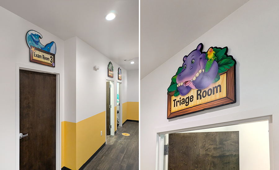 Even the exam rooms keep the theme going, with custom graphic signs showcasing friendly creatures, like a grinning shark sign above Exam Room 6 and the hippo above the Triage Room. Fun custom signage helps guide families through the space.