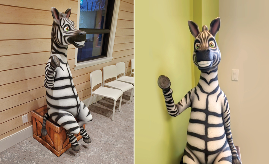 While seated in the waiting room visitors are kept company by a grinning zebra posed on a wooden crate. This jungle photo op is easily moveable so he can change up the look of the space up at any time and be easily decorated for holidays and events! He is also a very smiley guy and loves when guests pose with him to show off their pearly whites in a photo together. Themed photo opportunities create a perfect opportunity to encourage guests to share about their experiences in your space!