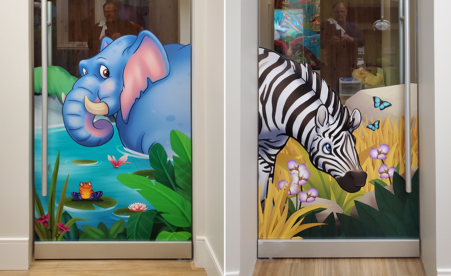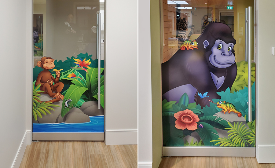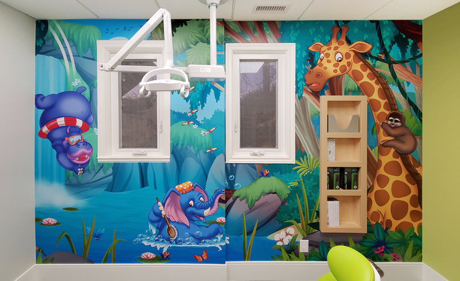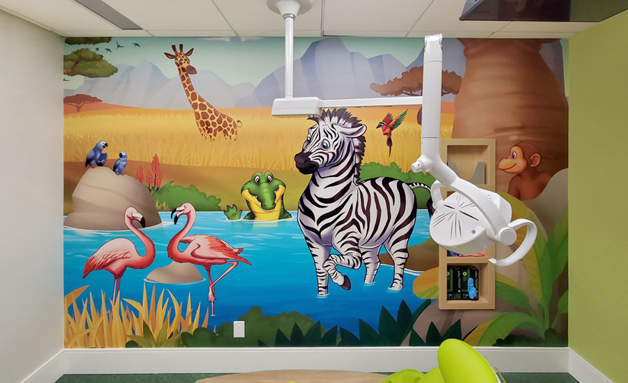 When patients walk into this wild jungle retreat, they are instantly pulled in by the vibrant murals that line the walls and windows. Each space has a different scene for little adventurers to embark on an imaginary journey. They can picture cruising down the river on the back of a hippopotamus, lazing in the watering hole with the animal kingdom comrades, or swinging through the trees with a gaggle of monkeys.