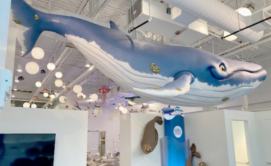 Patients should bring their goggles the treatment bay to see how many new creatures they can spot. The ceiling is outfitted with an array of aquatic characters like custom glass blown jelly fish, 3D sculpted stingrays, tuna, sea turtles, and a dolphin. When kids are in the chair, their mind will be anywhere but their cleaning.