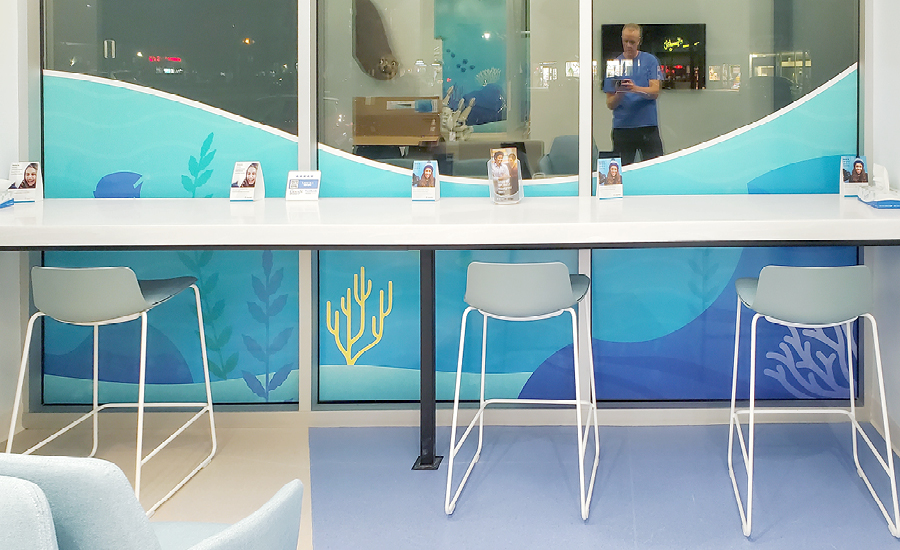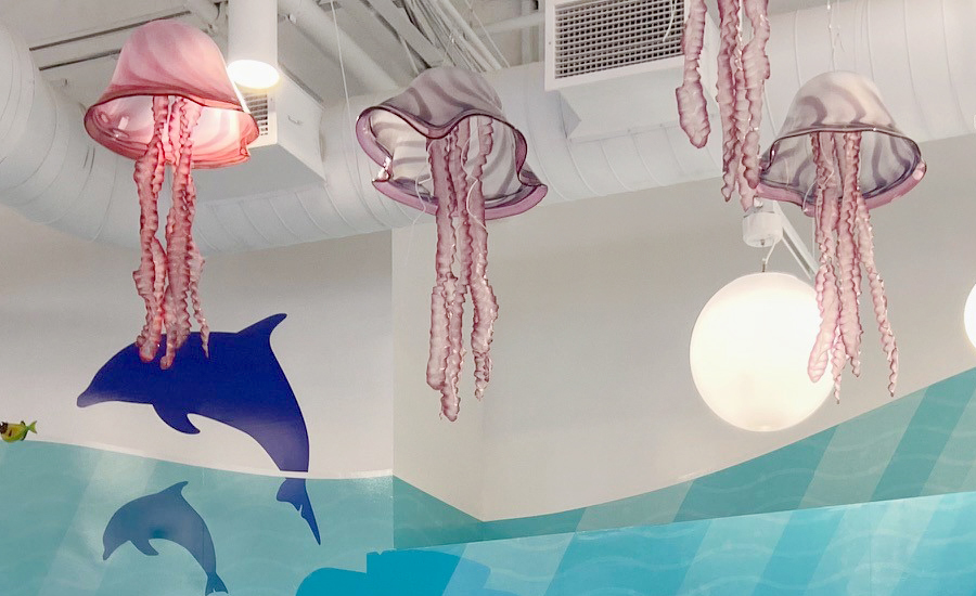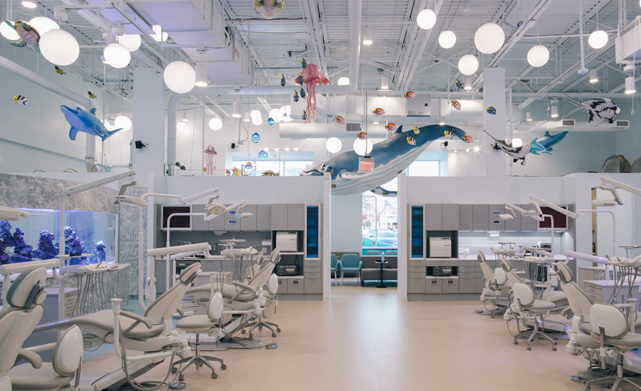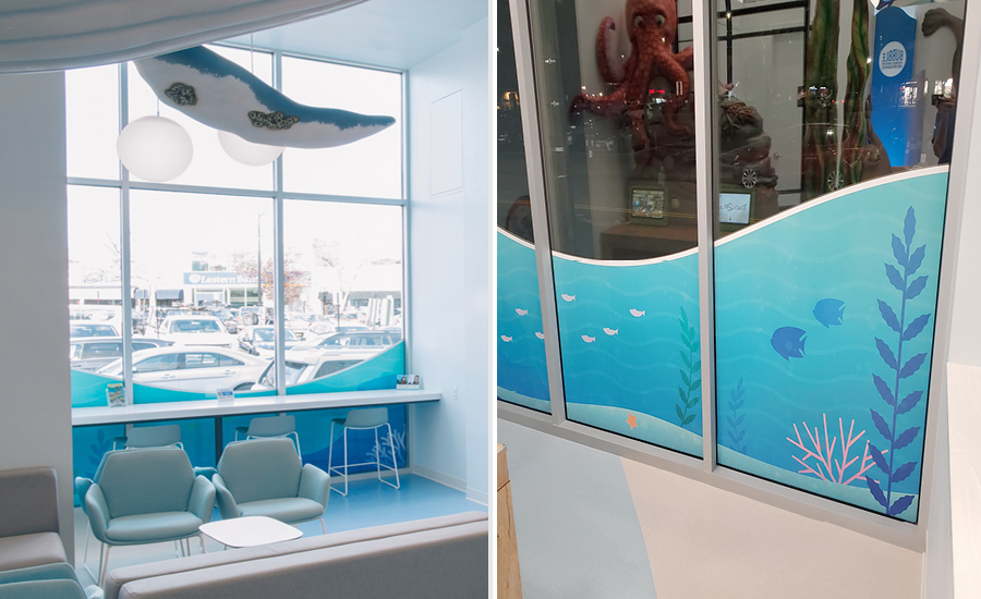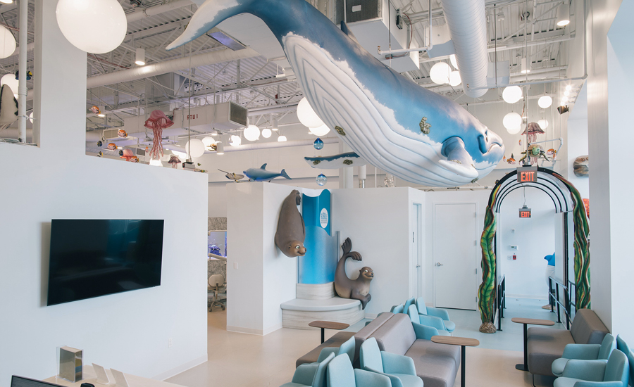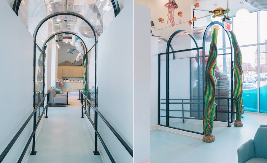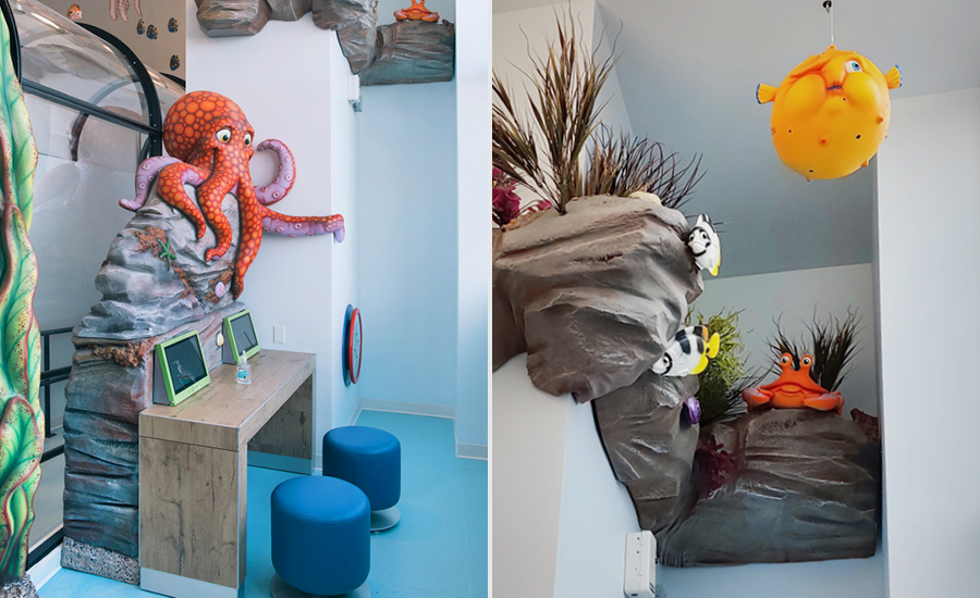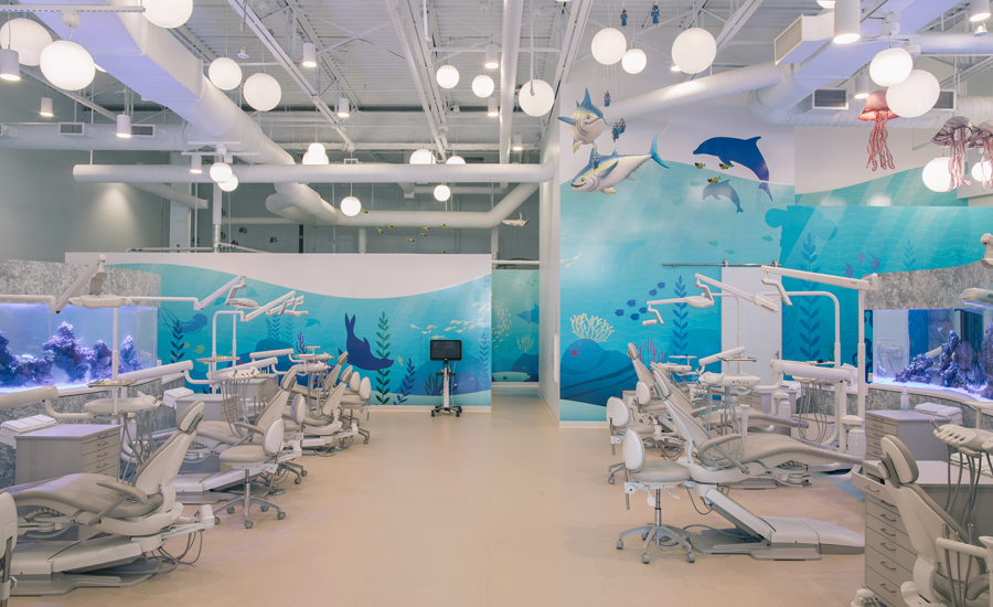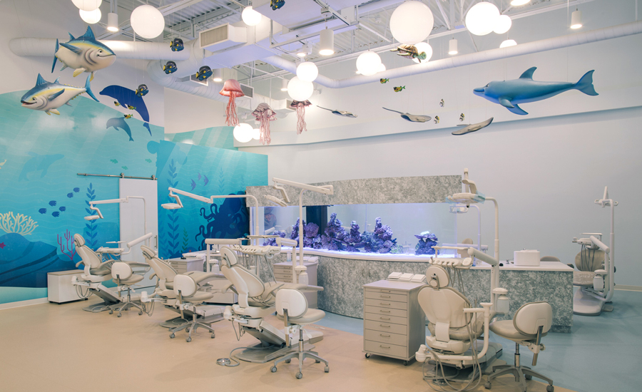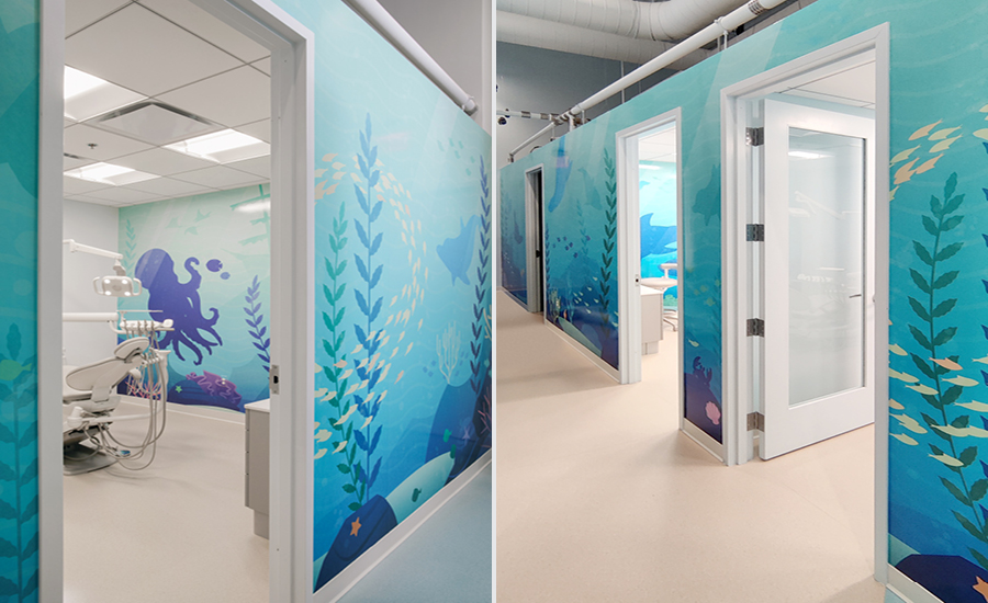 To extend theming throughout the entirety of their office, the treatment bay walls and examination rooms area are outfitted with contemporary underwater themed murals to bring this space to life.