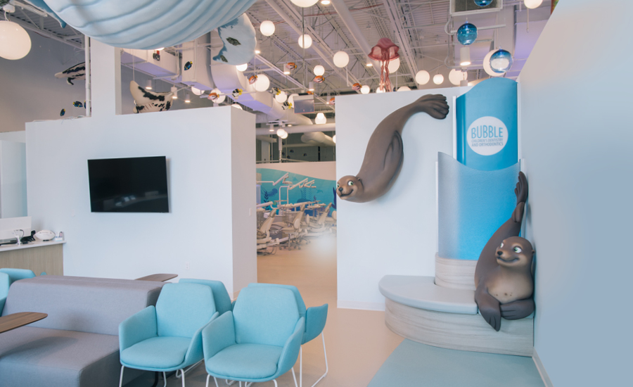 Patients and parents will feel like they have jumped into a giant aquarium in this pediatric and orthodontic dental practice. This space harbors a refreshing atmosphere, helping clients feel entertained and relaxed so the dental team can do what they do best – teach children good dental habits, wellness, and confidence for the rest of their lives. If you have any questions on what we can do for your space, you know where to find us.