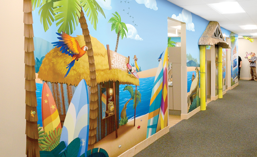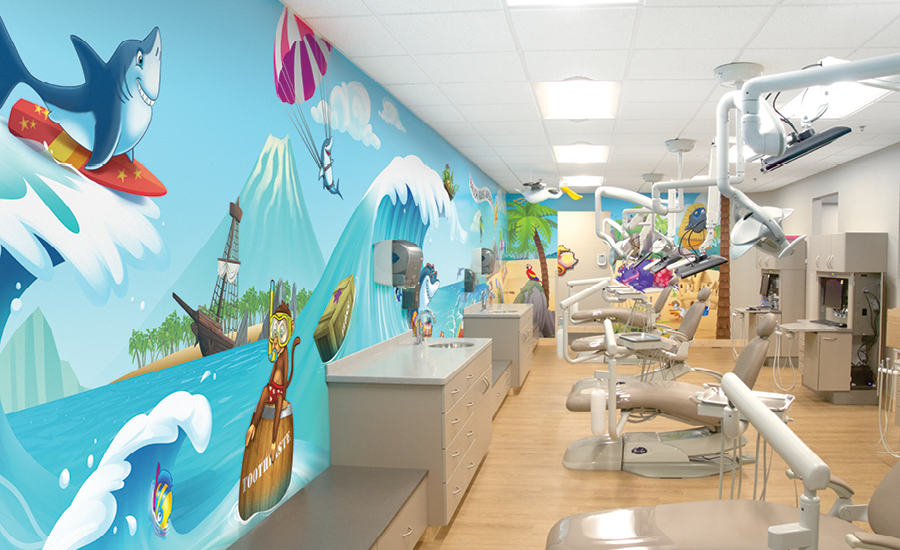 Swim back to the surface to find fabulous beach-themed wall murals that bring bright, friendly characters to the office. There are even turtles in the ceiling, ready to welcome children to the open bay!