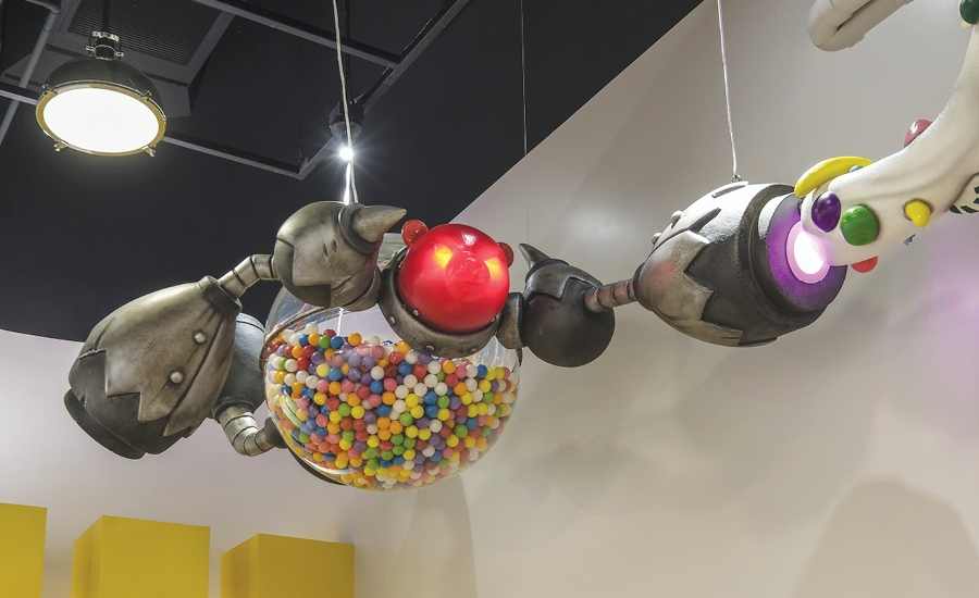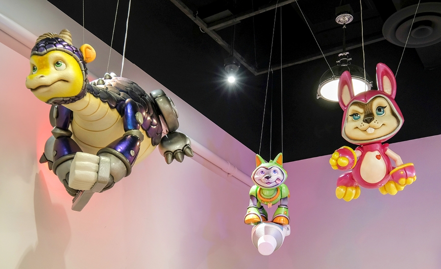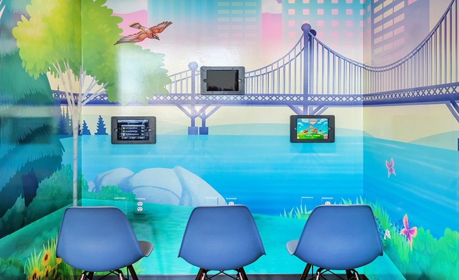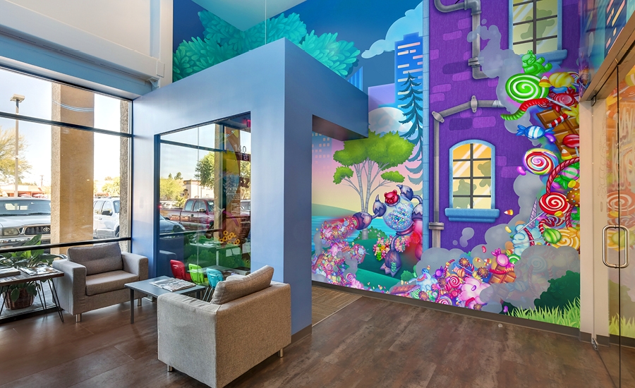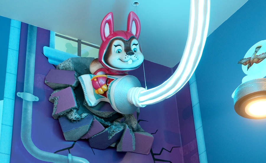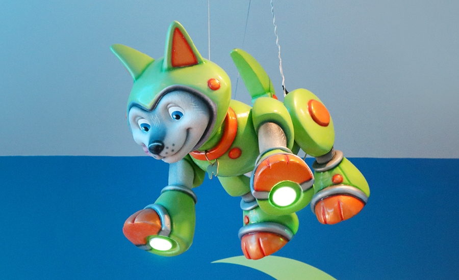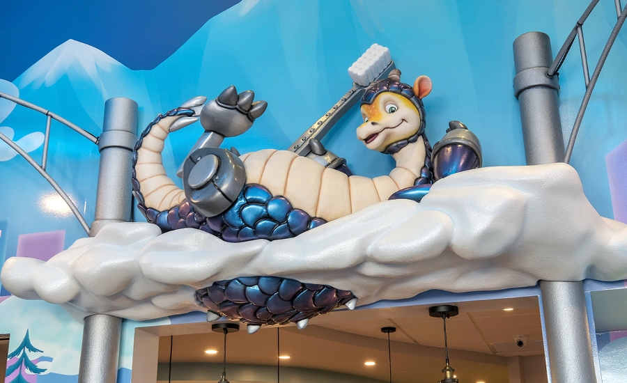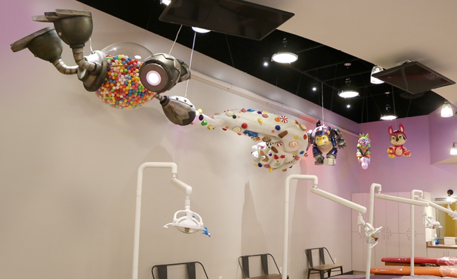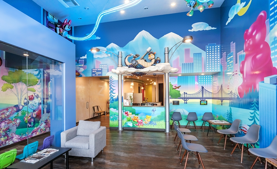The vivid murals in the waiting room illustrate a futuristic cityscape featuring our heroes and villains. There are 3D sculpted elements added such as Toki the rabbit wielding an amazing light-up LED toothpaste stream suspended over the waiting room. Yong the dragon playfully floating over the reception desk greets visiting patients.