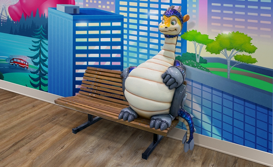 In the open treatment bay the battle continues to amuse children with the fully sculpted characters in exciting action poses. Details like pearlescent and color changing paint on the mech armour add even more uniqueness to this office. If all that isn’t enough there is even Yong the dragon as a photo op bench right outside the practice entrance. Children will have plenty of positive distractions to keep them entertained when they visit this incredible anime office!