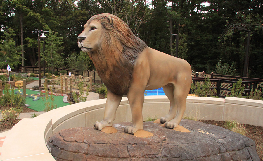Located inside a zoo, this mini golf course is surrounded by real animals, so the owners wanted a semi-realistic style for the sculpted characters.