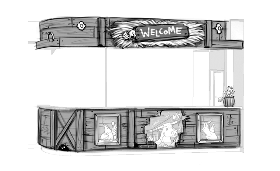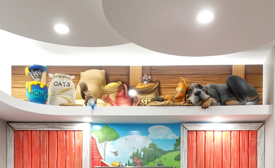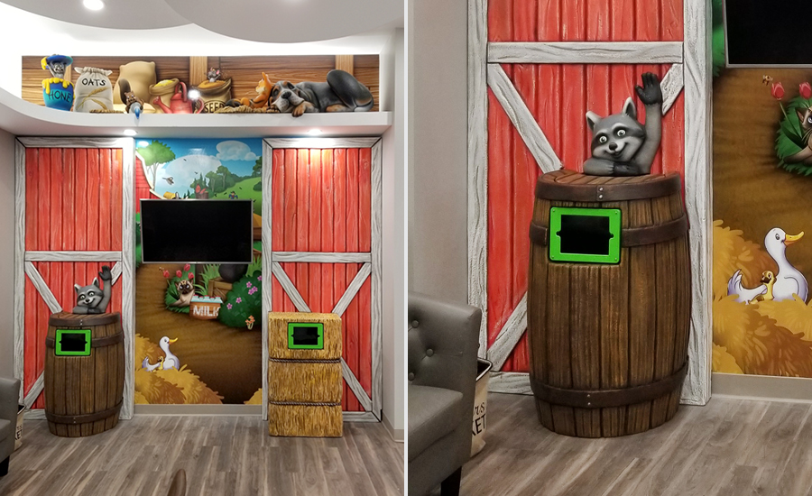 Across the reception desk is the fantastic kid’s play area. Young patients will be able to spend some time with the cute critters lazing around above the space, including a sleepy dog and the honey pot squirrel character. Game tablets were also mounted to a sculpted hay bale and a detailed barrel for even more immersion.