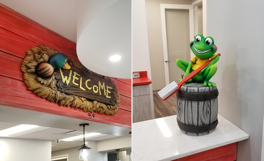 Patients will be greeted by the eye-catching reception desk. Featuring some wonderful sculpted red barn wood cladding, fun barn animals can be spotted throughout the portrait murals underneath the counter top. It also features custom hay inspired signage and the office’s charming froggy mascot!