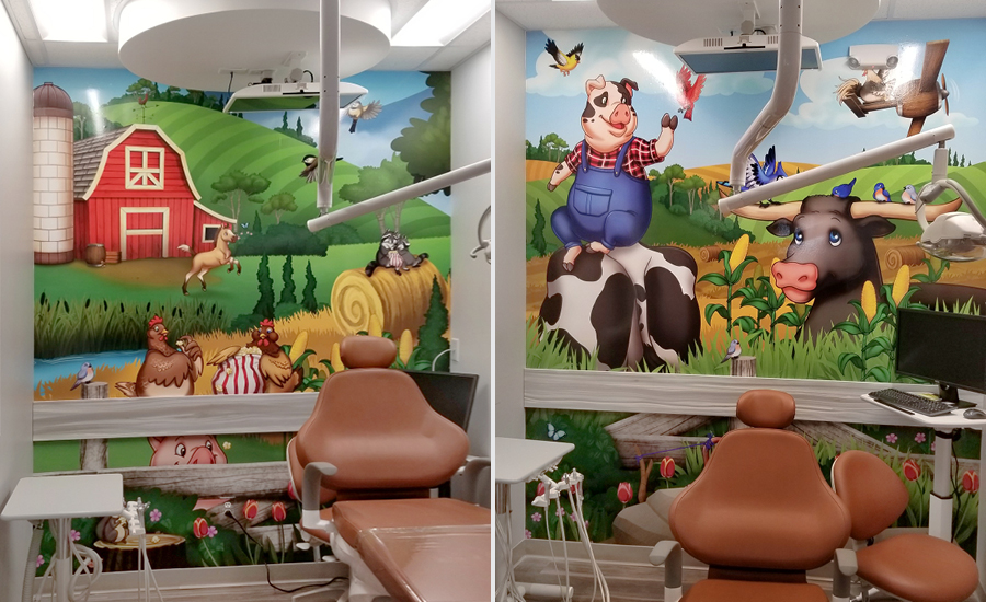 Inside the operatories, patients will be kept entertained by the delightful farmland murals, with a unique design adorning each of the individual patient rooms. Varying murals for treatment rooms is a great way to keep the experience fresh for patients when they visit for check-ups! The murals also feature a real wood fence panels that helps protect the murals from bumps and scrapes caused by chairs and trolleys.