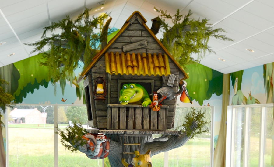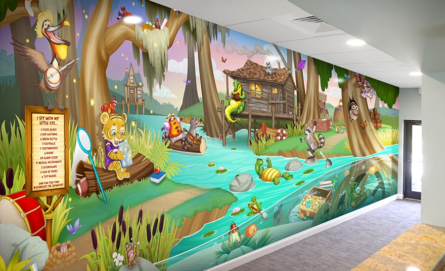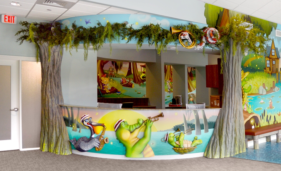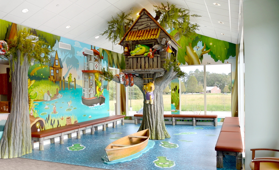 A unique floor mural lets patients take photos with the alligators that swim through the bayou. The tree house, which has televisions built into two sides, looks as if it is growing right out of the swamp and a boat floats in the water; ready for a photo op. Kids love to explore this bayou and make friends with all of the custom critters.