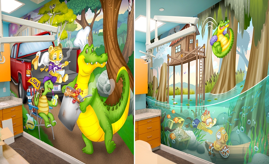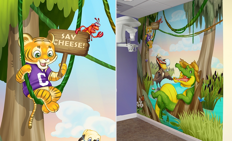 The office mascots were carefully drawn and sculpted into each of the scenes. In the main entrance you will find Boudreaux playing a banjo while Cubby climbs a ladder leading to their tree house. The mascots are also both featured in the murals, waving at patients and welcoming children to different rooms.