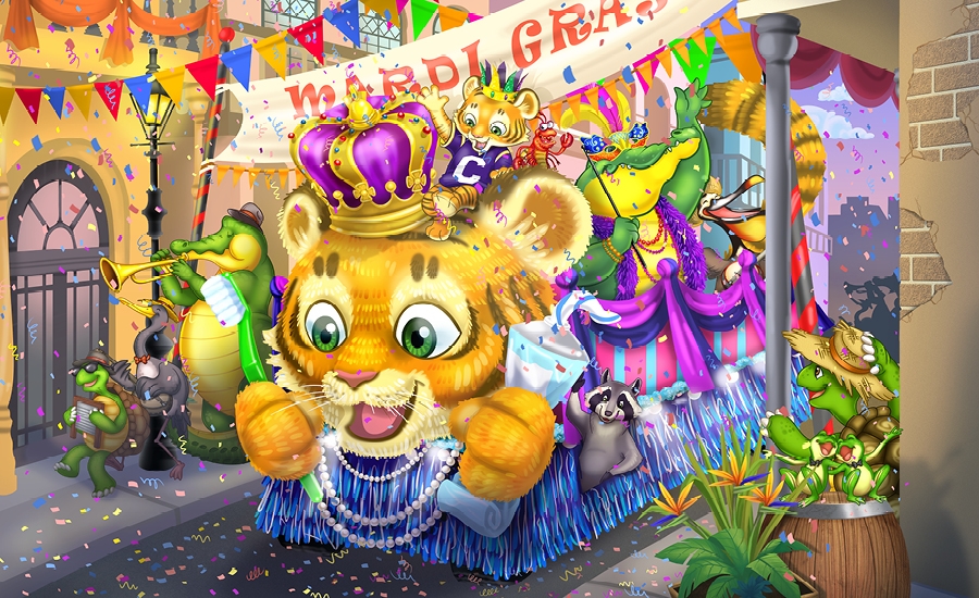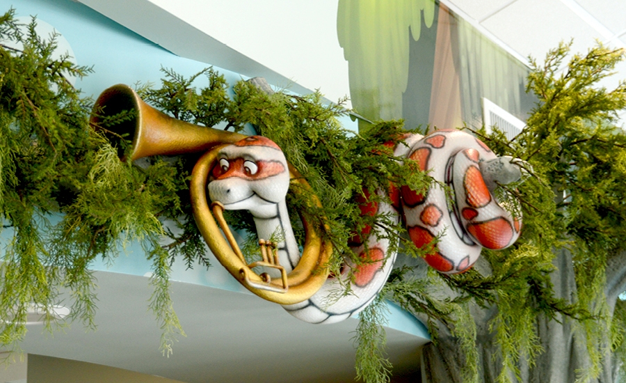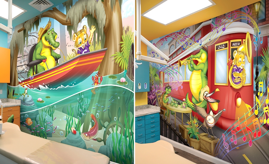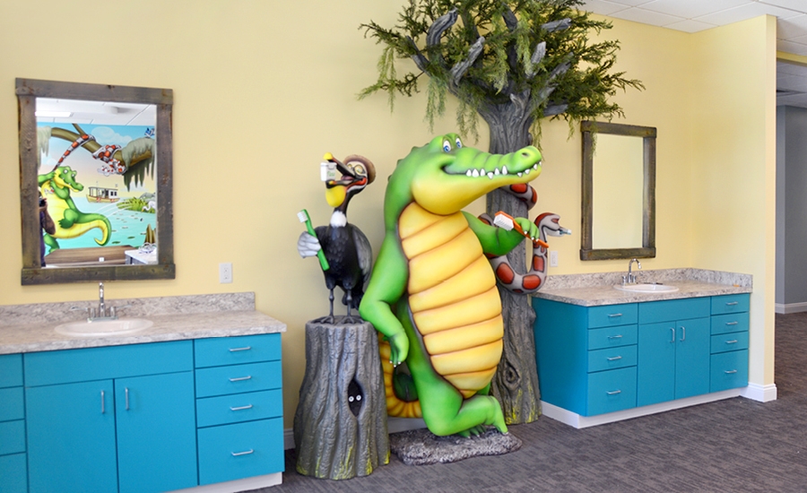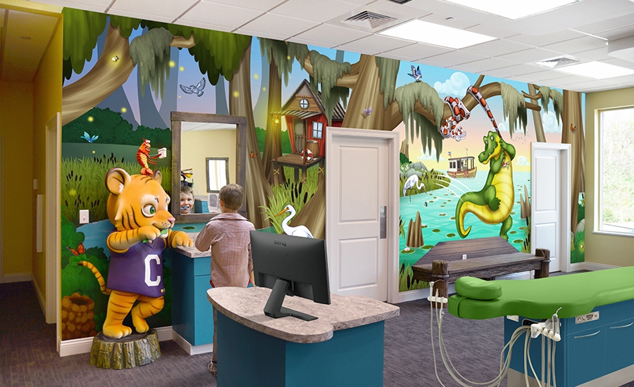 This immersive bayou themed office has been a huge hit with patients and staff alike! With music flowing through the theme, the animals play instruments and dance with mascots inspired by a local sports team.