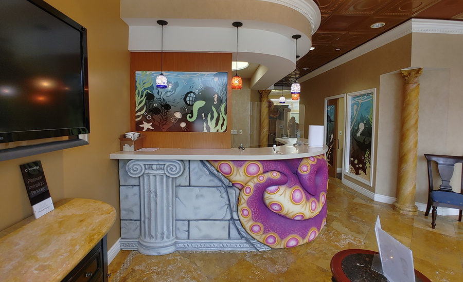 Patients are greeted at the door by the tentacles of a curious creature lurking behind the reception desk – could it be a giant kraken guarding the gates of the lost empire of Atlantis? We custom painted these tentacles in a unique style to match this office’s unique esthetic.