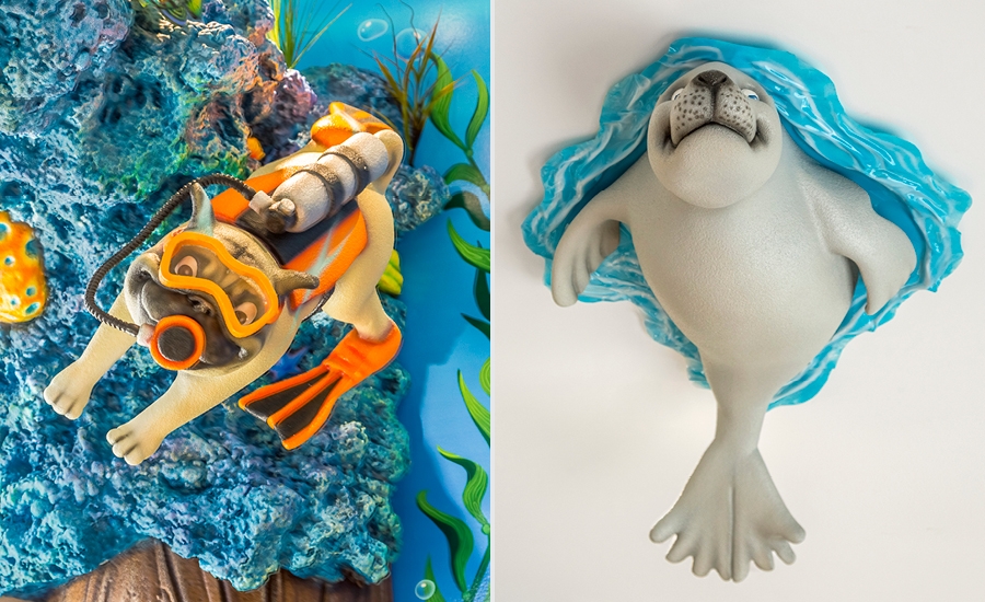 A group of rolly polly pugs scuba dive in a photo op mural by the front desk, which includes the office’s logo.