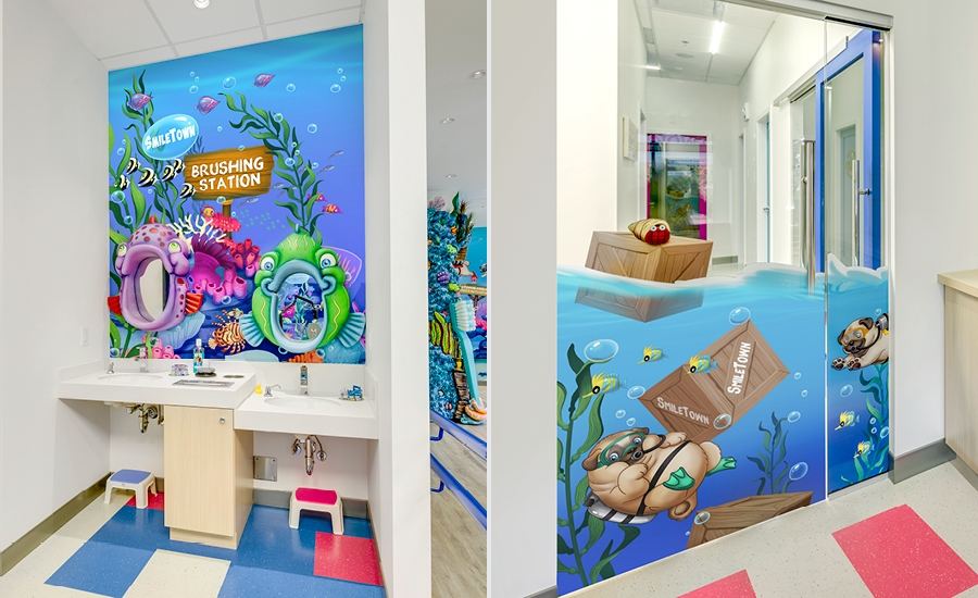 This playful design incorporated a school of pugs learning to swim in 2D and 3D, fun dental fact bubbles throughout the murals, an I Spy picture find mural, and a bright 3D coral reef reception area.