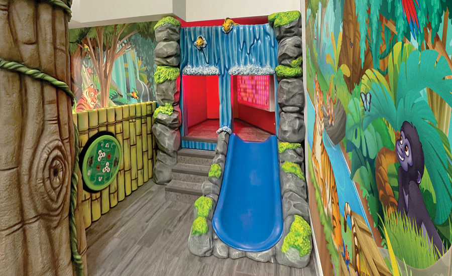 At the heart of the oasis lies a bustling play area. Children can let their creativity run wild with hands-on KeeBees or embark on a thrilling journey down our custom waterfall slide. But the excitement doesn’t end there – hidden within the waterfall fort is a treasure trove of entertainment, featuring the captivating light board that changes color with touch and pressure.