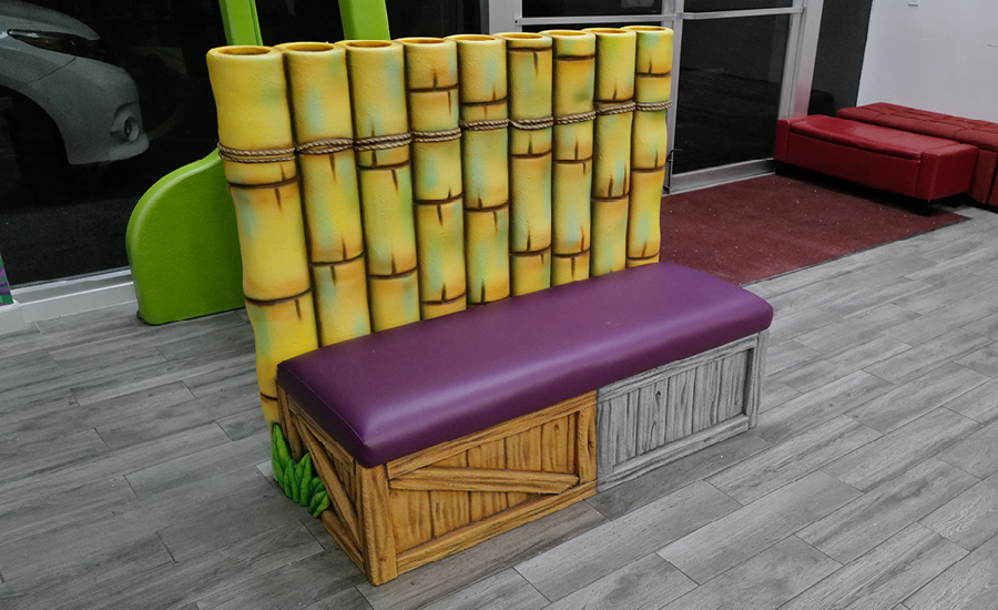 Towering over the space is a magnificent jungle tree, reaching for the sky! With two stories to play with, we’ve crafted an immersive experience that uses the whole space. A flamingo photo op character, bamboo welcome sign, and bamboo bench seating, and Jeep photo op complete the aesthetic.